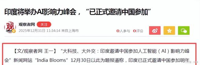 印度官宣将在明年初举办AI影响力峰会,并邀请中国和美国一并参加,印方透露,美国部分代表已确认参加,中国还未给出明确信号。 但印方给出了两个理由,中国可能会参加,那么,印度给出了什么理由?印度为何要举办这样一场峰会? ...